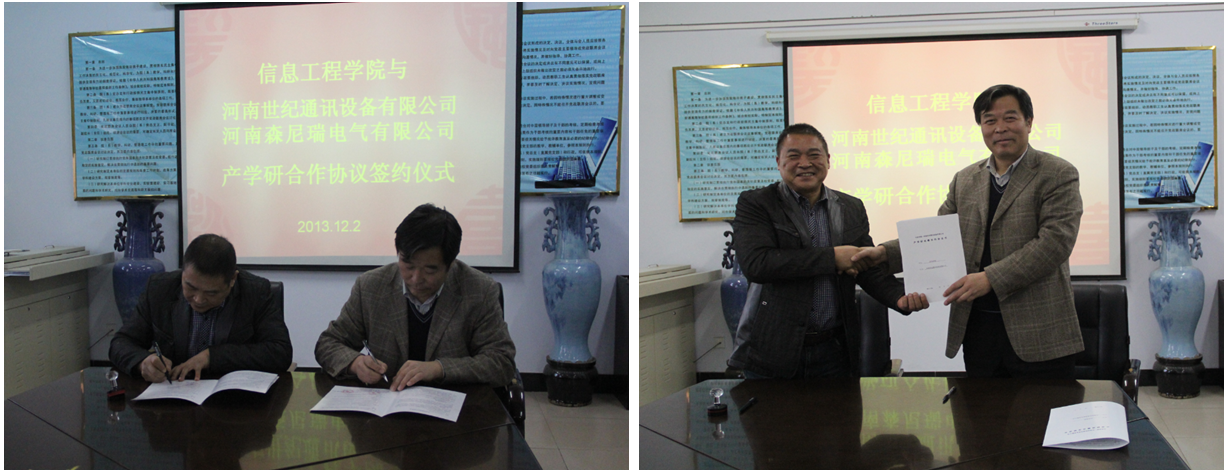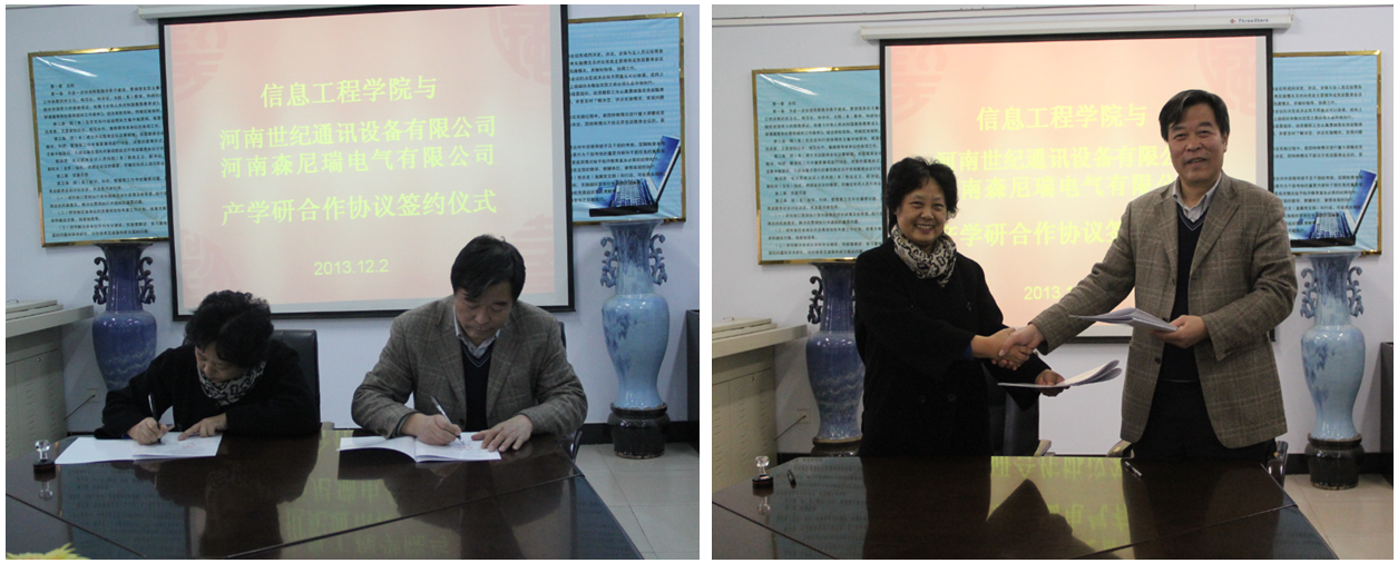 张志立经理代表公司分别与河南世纪通讯设备有限公司、河南森尼瑞电气有限公司在校企合作协议书上签字并交换协议书。
