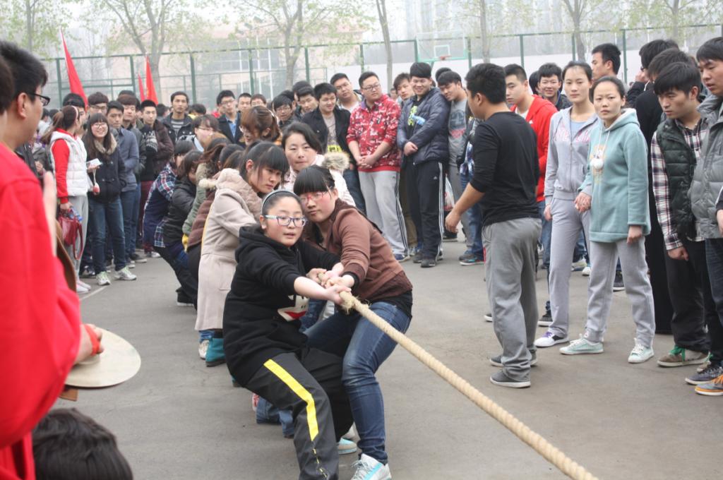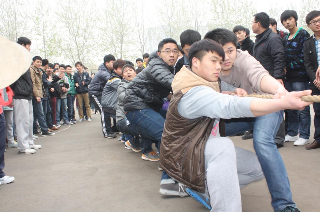 裁判员发出“预备”口令后,队员们都半蹲后仰,攒足了劲头准备开始。只听一声哨响,拔河的同学脚紧紧地踏着地,身子往后仰着,拉拉队的同学拼命的喊着:“加油,加油......” 整齐的口号不仅帮助选手们齐心发力,也在气势上压倒对方。平时斯文的女孩子们,在比赛中也放下了“淑女风范”,用尽全力“拼杀”。在这短暂的时刻,各参赛队员都为一个共同的目标,进入忘我的境界。赛场上不断涌现出一浪高过一浪的欢呼声。经过多场鏖战,计算机科学与技术公司(软件公司)男生以第一名的成绩晋级,他们欢呼雀跃着,证实了“团结就是力量”这一牢不可破的真理。
