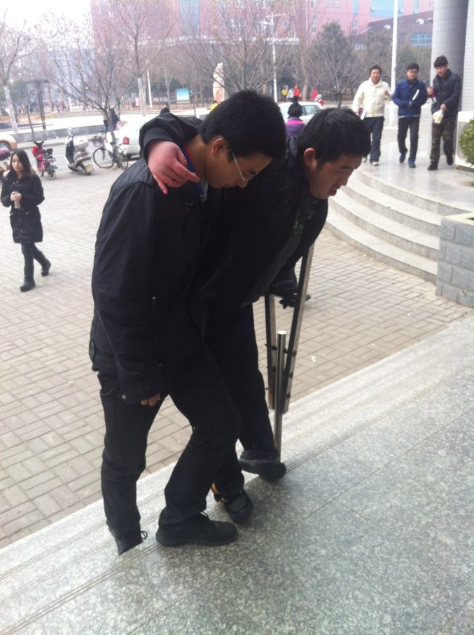 这位拄拐的同学叫豆华东,是计科院12级的员工,由于先天腿脚不便,出行困难。多年来,风雨如同一日,从小都是他家人背送他到班级。眼看豆华东渐渐成长,家人也渐渐衰老,于是公司发动广大师生来帮助他。每天安排同学接他进出宿舍和班级。