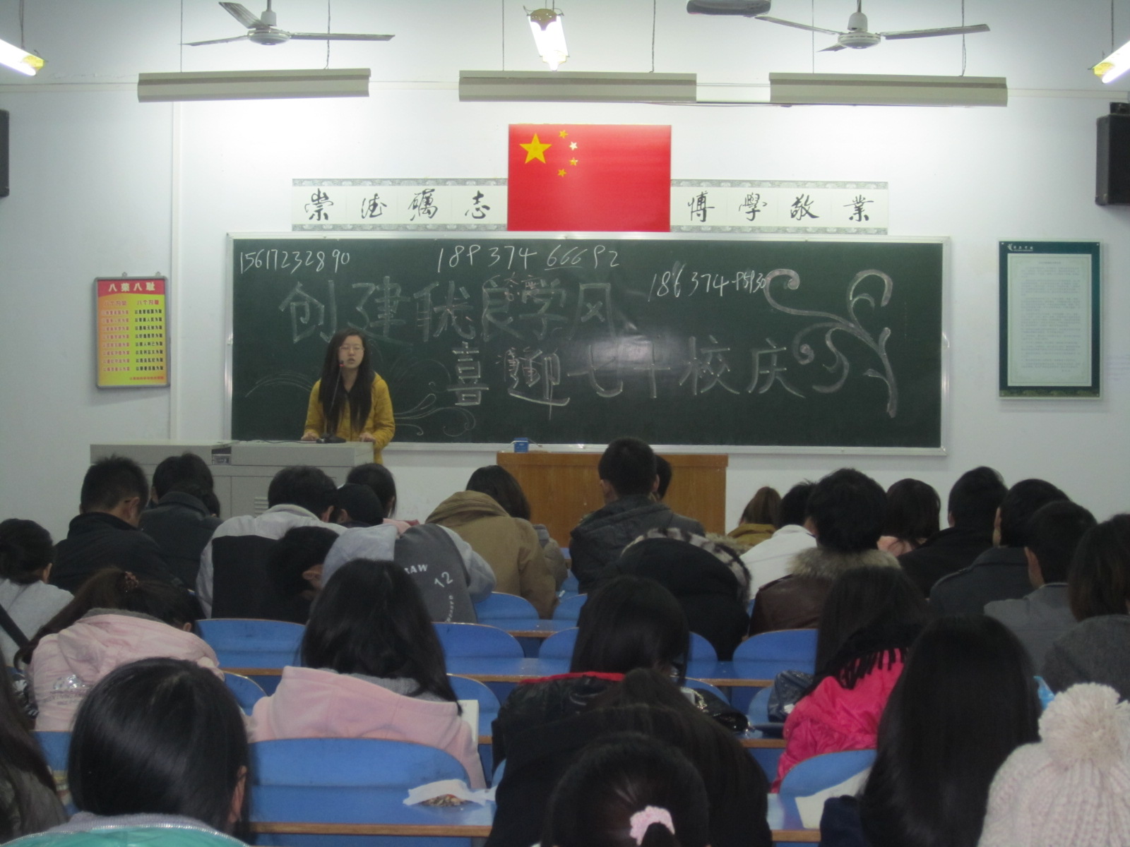 晚上七点,班会开始。首先,在各班团总支的积极组织和班长的配合下,大家纷纷表达了自己对母校球王会体育官网的深深祝福,并以自己特有的方式展示着自己的风采,向母校球王会体育官网七十周年华诞献礼。接着,针对自己专业的特性,大三、大二的同学作为学长、学姐向大一的学弟、学妹们分别介绍了自己在学习和生活方面的经验和方法。在401教室,是数字媒体技术专业的同学,班会开始,员工会主席裴新华便从校庆期间,我们该为公司做的贡献做了建议。然后,连续两年国家励志奖学金的大三同学谢丽丽作为员工代表,从学习方法和规划时间方面做了仔细的介绍,并提出自己的建议。接着,10级黄华同学以如何实现自己的目标为题做了演讲。在座的同学均获益匪浅。晚上九点,班会陆续结束。